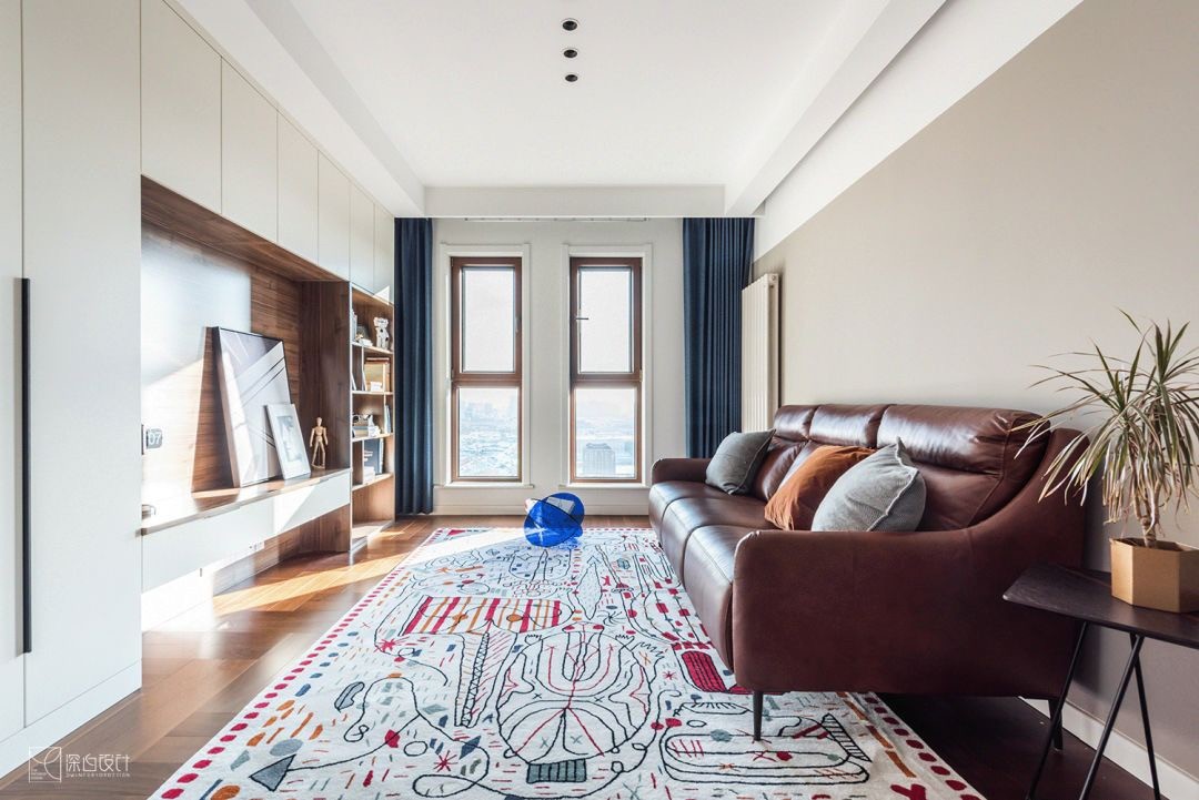 客厅区域面积扩大,各空间的连接关系增强,硬装上没有太多装饰,在材料的使用上也是尽量以白色木色等纯色为主。