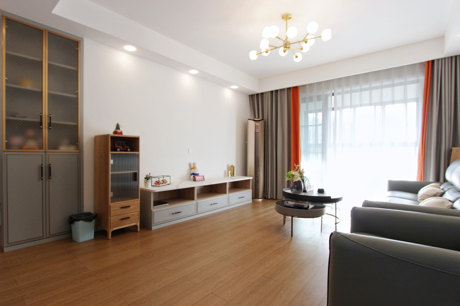 电视柜旁摆放原木立柜,连接嵌入式橱柜与客厅的空白处,使得空间更加和谐。