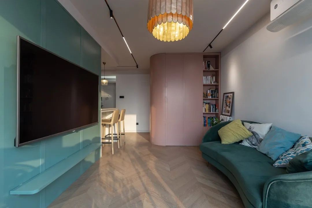 本案例这套使用面积48㎡的小户型,属于90年代老破小,装修后做到完美逆袭,塞下了开放式厨房、储藏间。牛油果绿+脏粉色的搭配,看起来简洁时尚小清新。