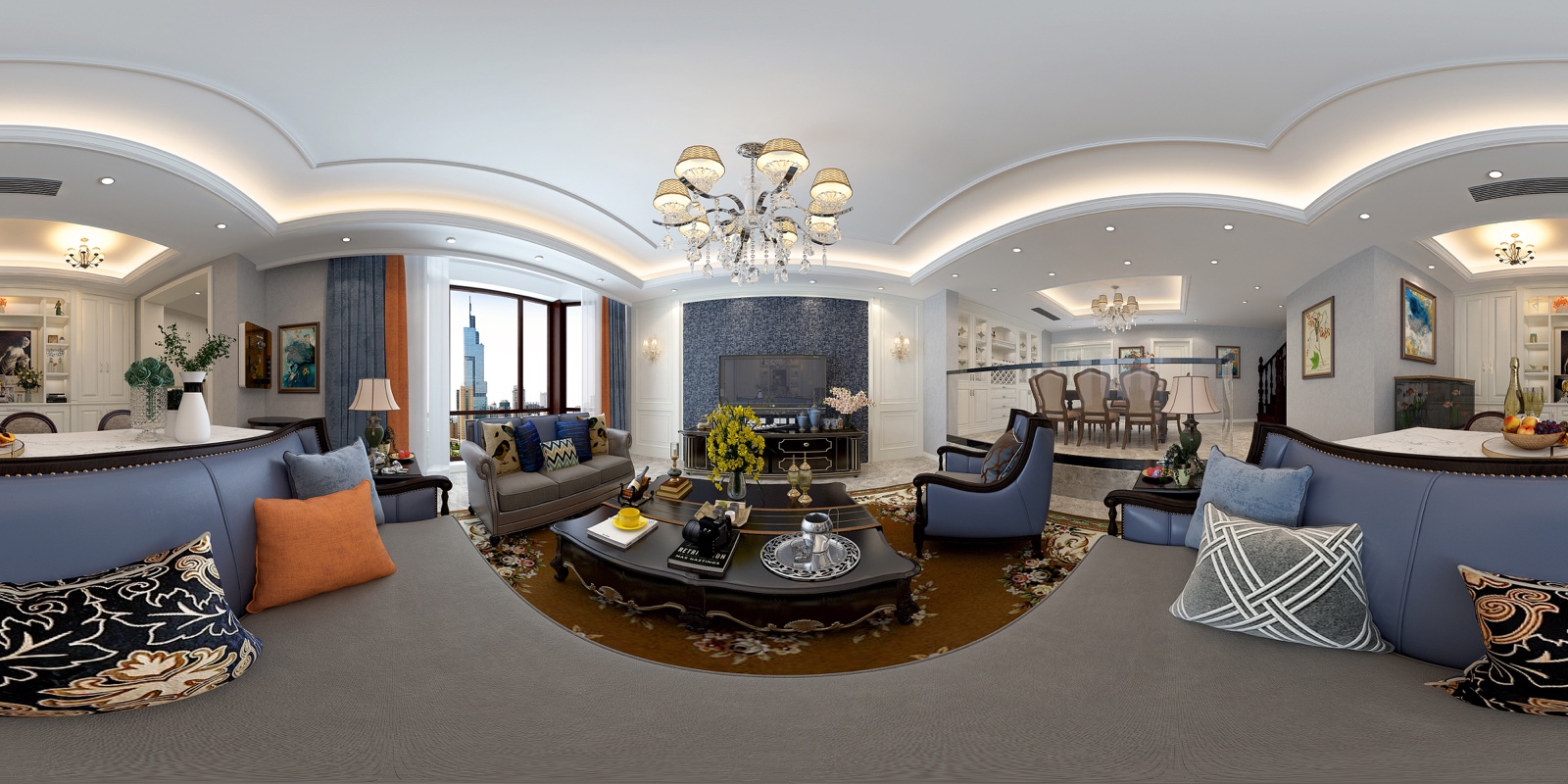 整体风格为简美式 高贵华丽具有浓厚的文化气息 在家具选配上 一般采用宽大精美的家具 配以精致的雕刻 整体营造出一种华丽 高贵 温馨的感觉