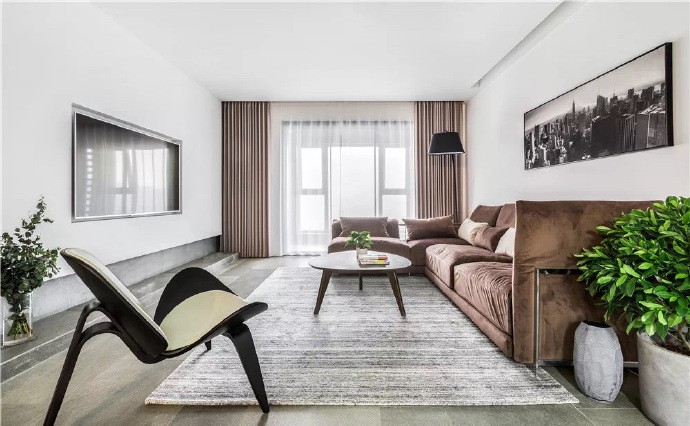 这是一套145㎡的现代水泥灰设计,褐色的布艺沙发,搭配棕色简易的实木茶几,在灰色地毯的搭配下,呈现出舒适优雅的空间感。
