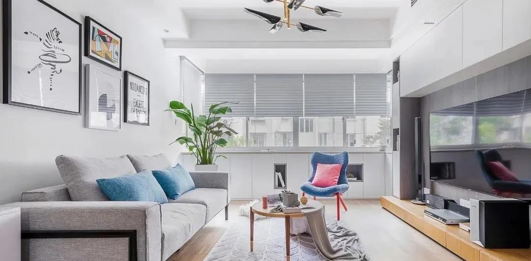 留白墙面点缀不同尺寸装饰画 灰色布艺沙发添加蓝色靠枕提亮 给绿植配了可以滑动的花盆底座 方便给绿植挪位晒太阳。
