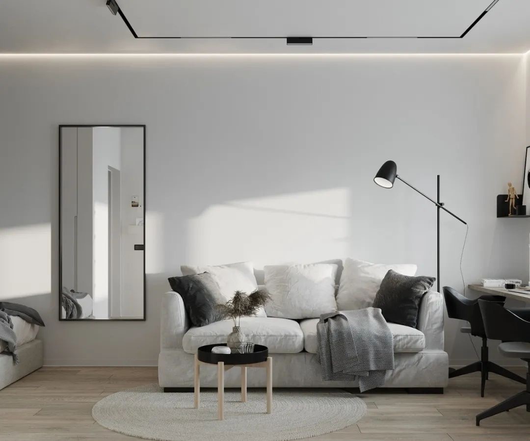 客厅和其他房间整体做无主灯设计,在光线上对空间做出区域划分,同时在选材上也采用明亮的材质,整体空间整齐划一。