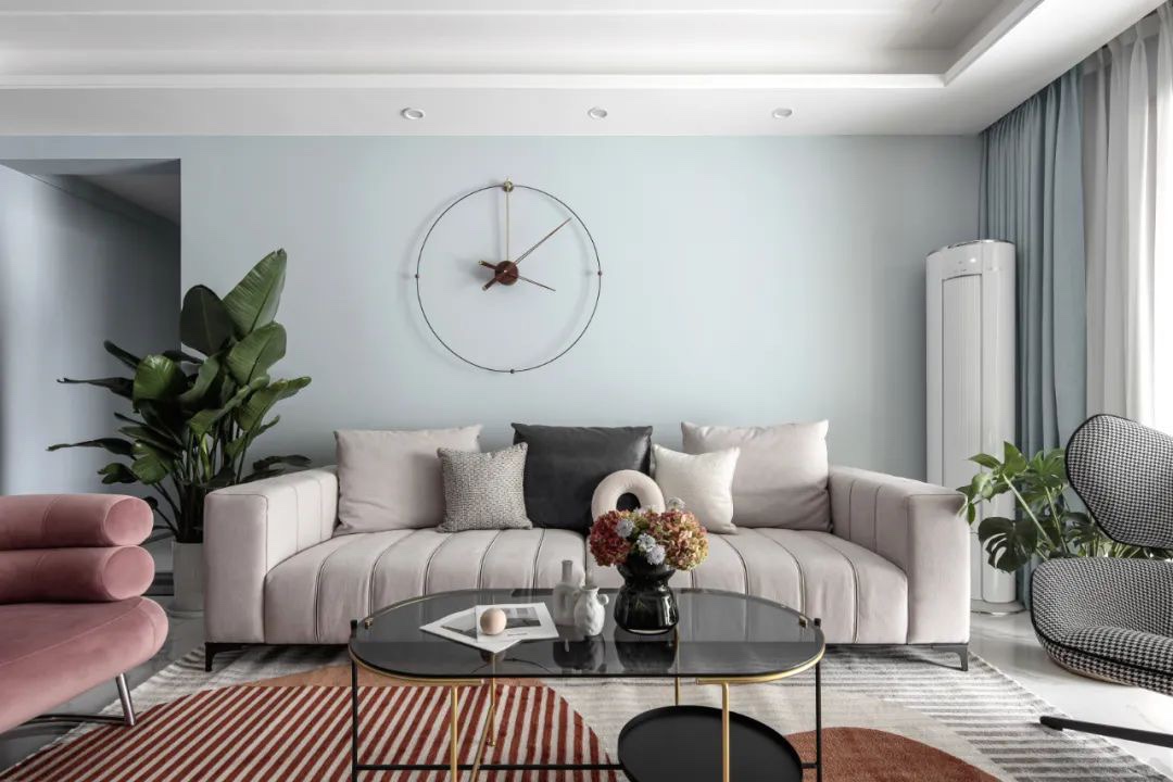 因为硬装上没做过多的造型,在客餐厅的改造上算是真正符合“轻装修重装饰”的思路。我们把改造放在了色彩营造的视觉张力上,所以全屋的墙面选了浅灰蓝做底,不过于浓烈,但又不似白墙般单调。