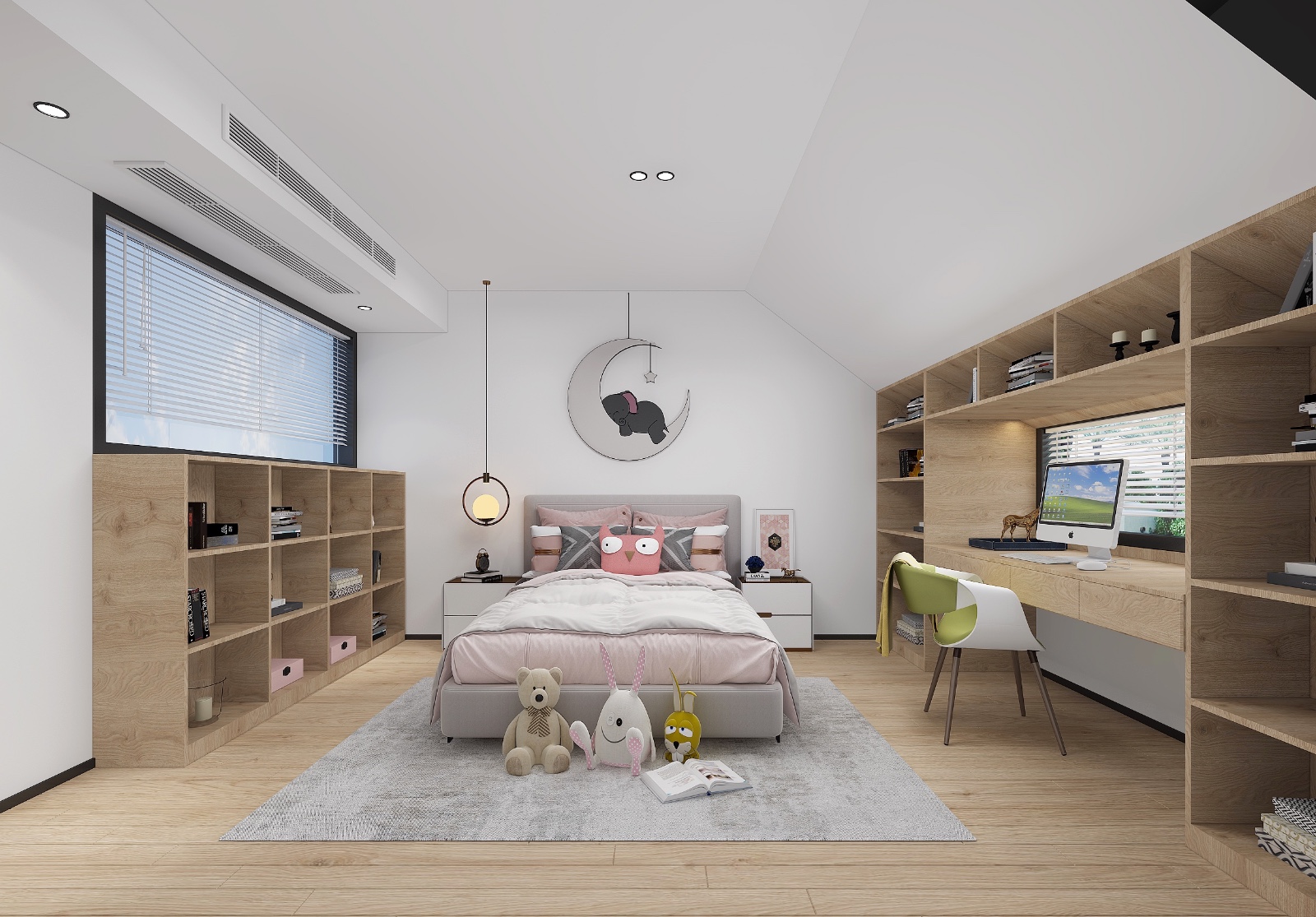 玻璃增加阁楼的采光,使功能齐全的儿童房看上去更加活泼可爱。