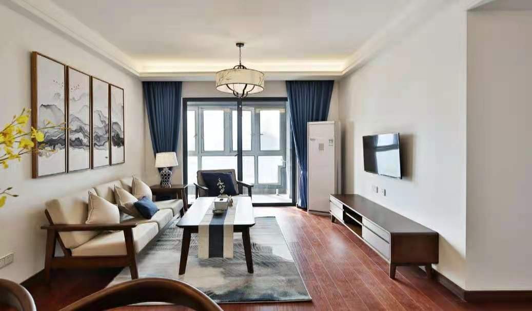沙发和装饰画配上地毯,一个空间的生命力就浮现出来了,客厅点缀了青花瓷蓝色抱枕和蓝色窗帘,用来贯彻全案,跳舞兰的黄色配合青花瓷蓝,是一种强烈的对比色。