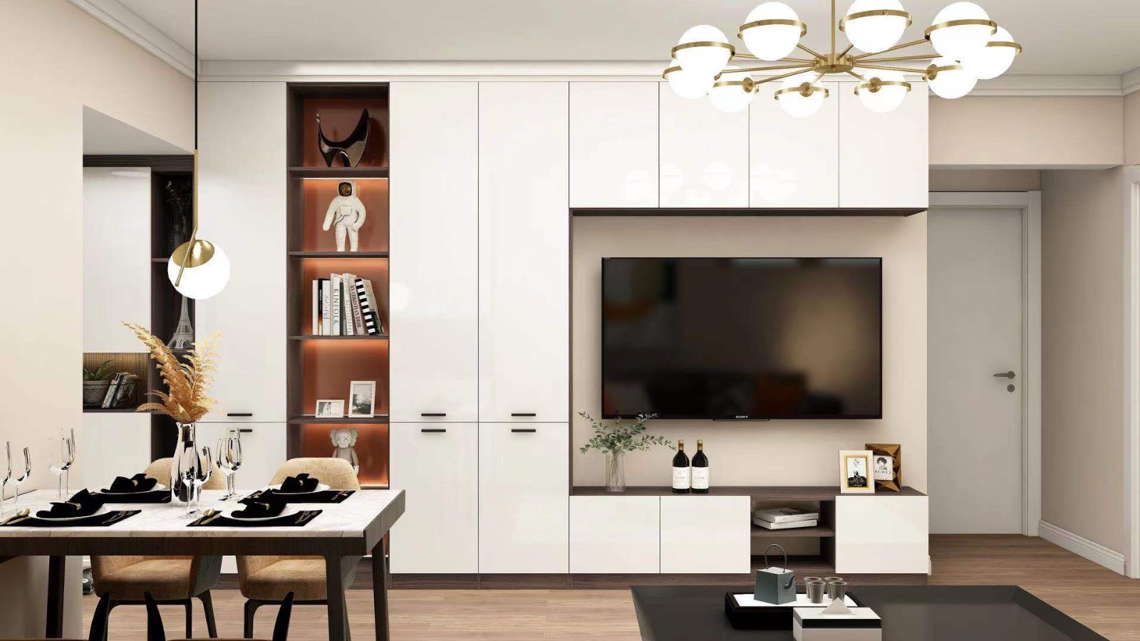 客厅整体空间以简约大气为主,定制通顶展示柜,电视上墙