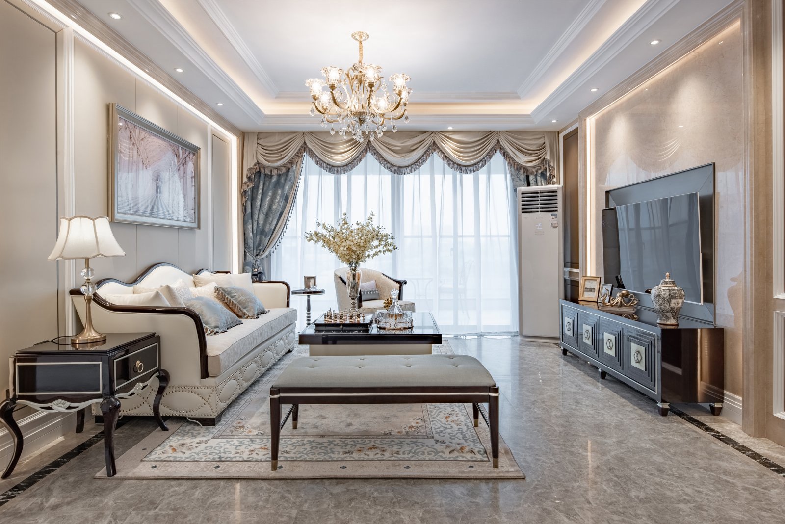 客厅明亮,石材与硬包的搭配加上灰色的瓷砖凸显欧式风格。