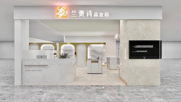本店主要色彩为白色、玫瑰金,简洁的搭配使得店内的整体风格偏向简洁、高端优雅,符合我们想要吸引的客户人群的审美,使得店铺脱颖而出,让人眼前一亮,店内柜架主要以白色柜体搭配玫瑰金线条为主,整体的简洁加上隔层灯条的渲染,使得展柜中的产品闪闪发光,突出重点。