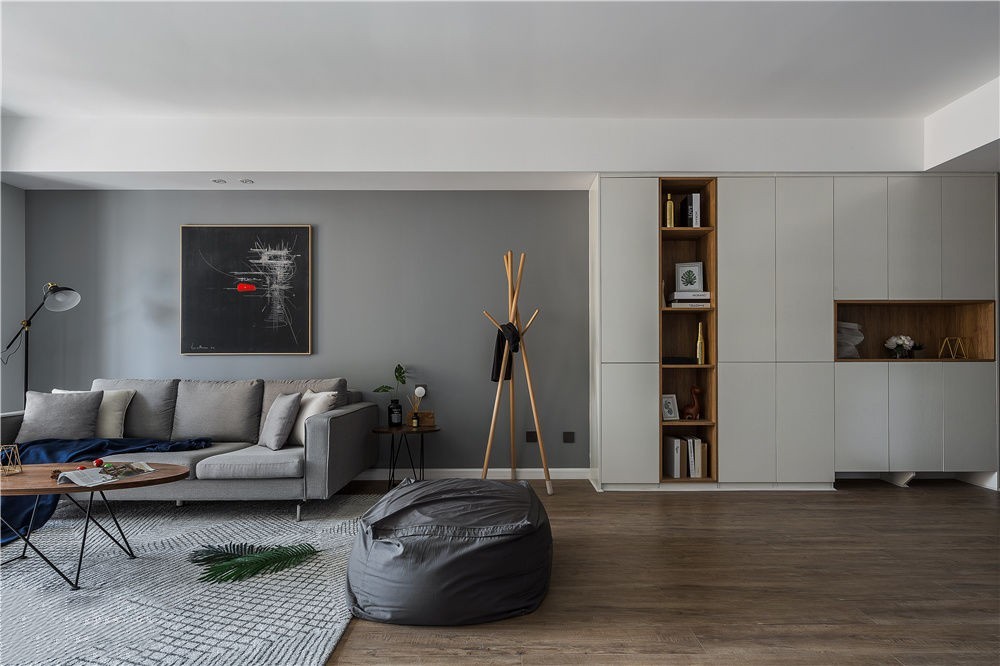 由于业主对于轻工业风格的喜好,加上对家中舒适、整洁的考虑,设计师在对整个空间进行规划时选择以浅灰色系为主,加以不同明度的灰色运用到空间中,奠定空间风格,加入原木色家具和白色收纳柜柔化工业风带来的冷峻感,打造温馨舒适家庭环境的同时,保持空间可做深度思考的氛围。