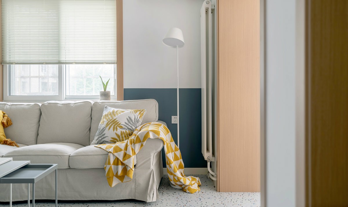 沙发一角黄色的挂毯与抱枕颜色相呼应,背后的上下墙与落地灯来凸显沙发的质感