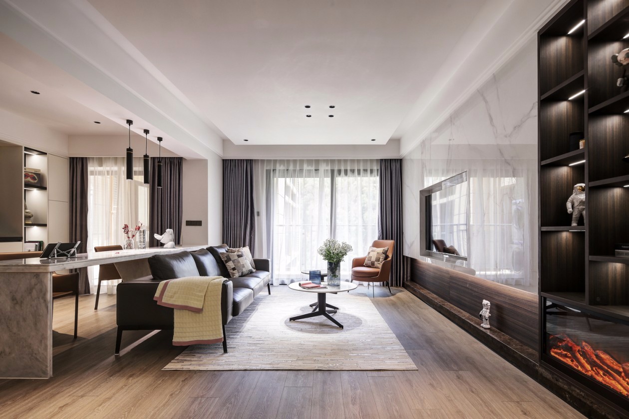 白色渲染明亮氛围,木色奠定舒适意境,家具则用深色来搭配,拿捏得当的色彩搭配所带来的现代设计感,不仅让客厅空间更显宽敞通透,而且大大提升了空间质感。