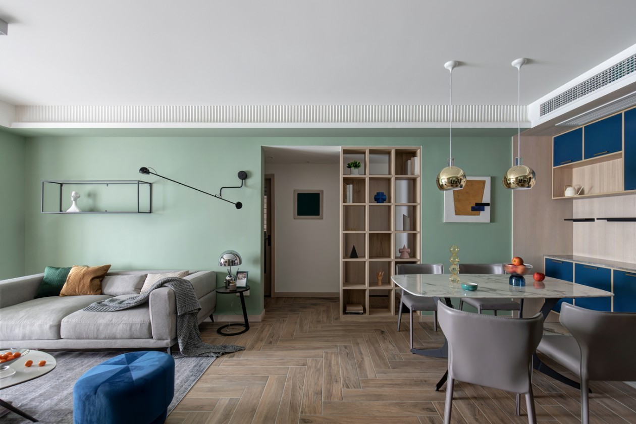 本案业主为三口之家,是业主的改善住房,整体定位现代休闲,整屋***块手法处理,原木色饰面板+3种绿色+藏蓝色局部跳色。整屋人字拼地板砖、鱼骨地板铺设,色调清新淡雅,轻松舒适……
