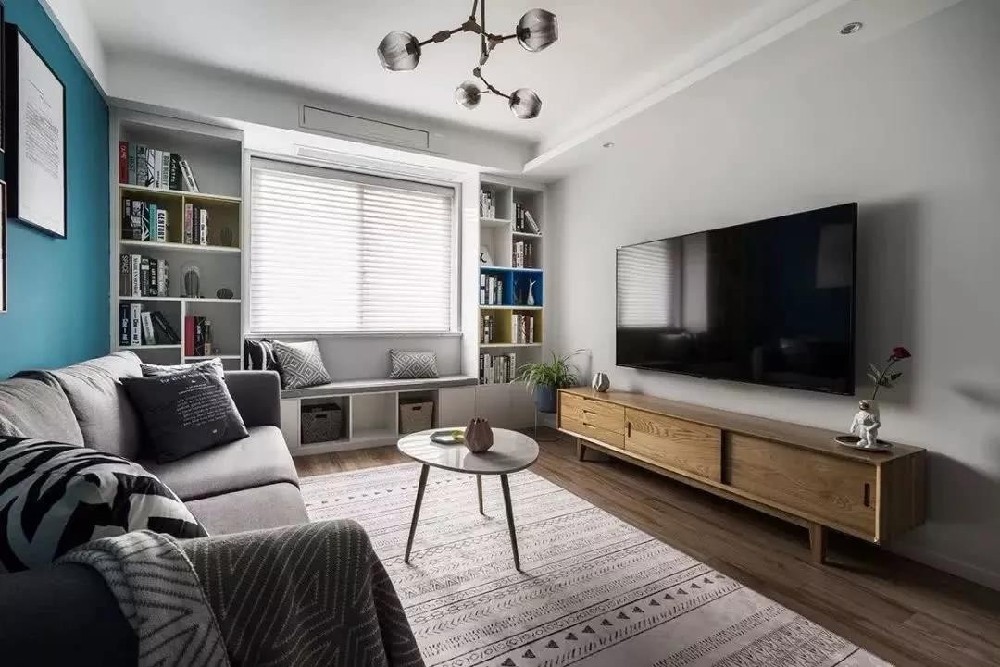 浅灰色的电视背景墙更显简洁感,飘窗被改造成休闲区,在两侧打造书柜,增加收纳空间。
