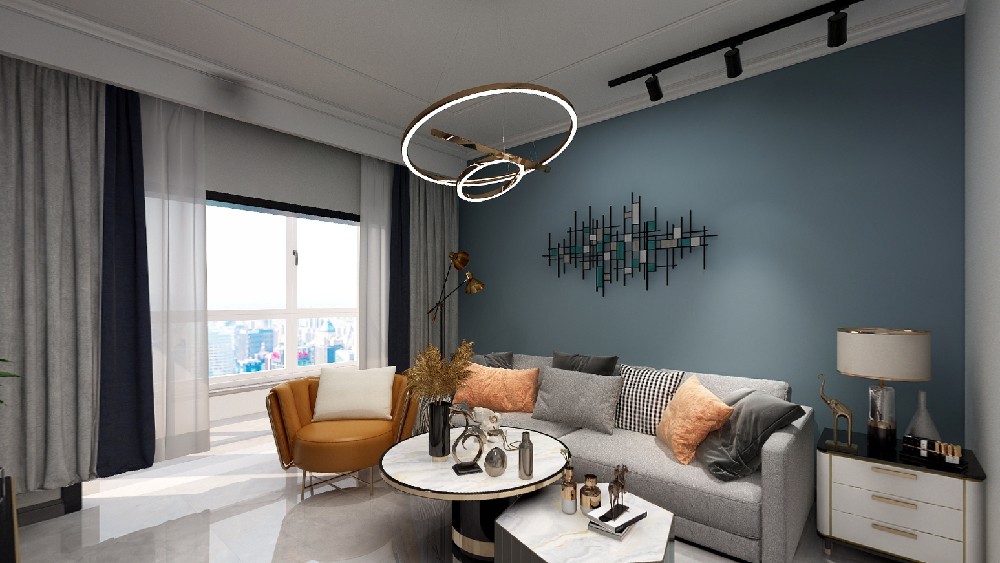 客厅主体蓝色的沙发背景墙,简约优雅的客厅搭配冷色点缀,整个空间散发一种轻奢典雅的氛围。