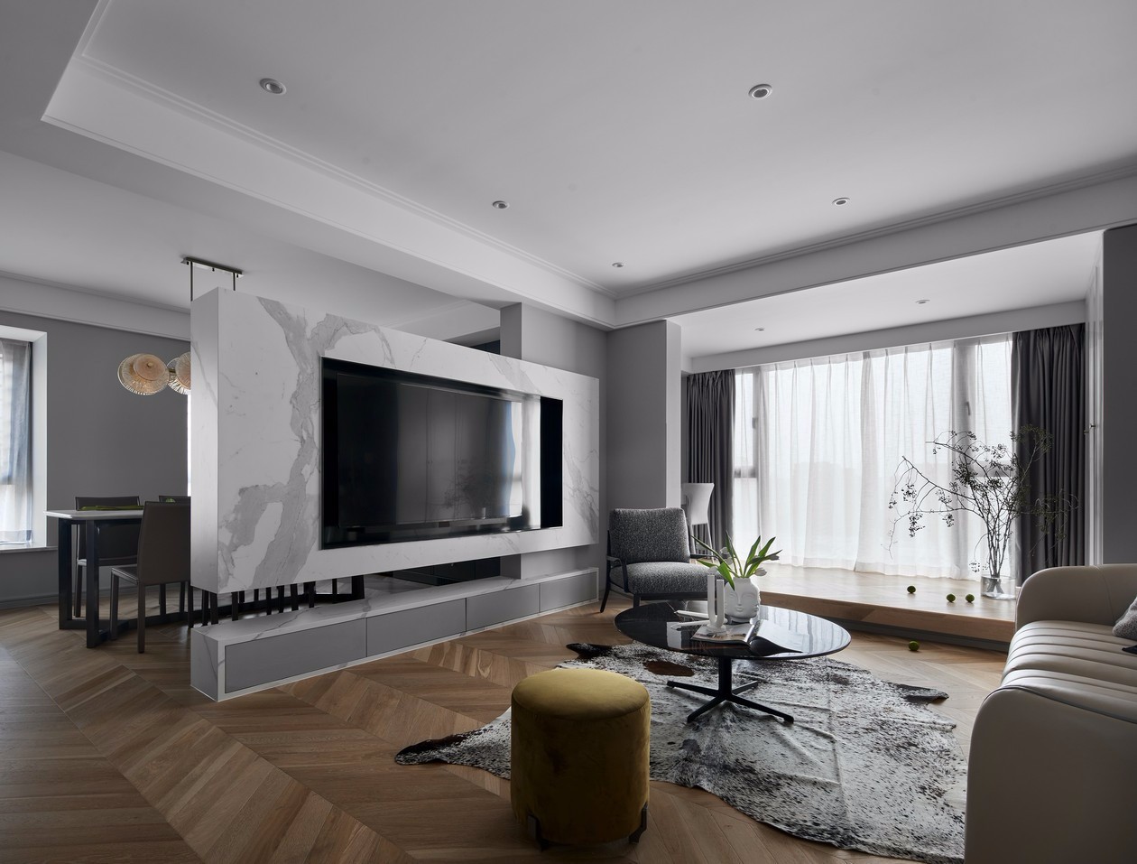 客厅、餐厅、厨房三者的开放式布局,流畅灵活,悬空的电视墙巧妙的划分空间,提升社交娱乐功能的灵巧性,增加家人之间交流互动的美好生活氛围。