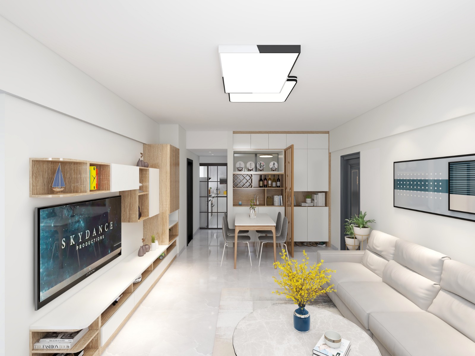 客厅的设计为暖白色,在精致的小圆桌是哪个摆设上黄色的蝴蝶花。