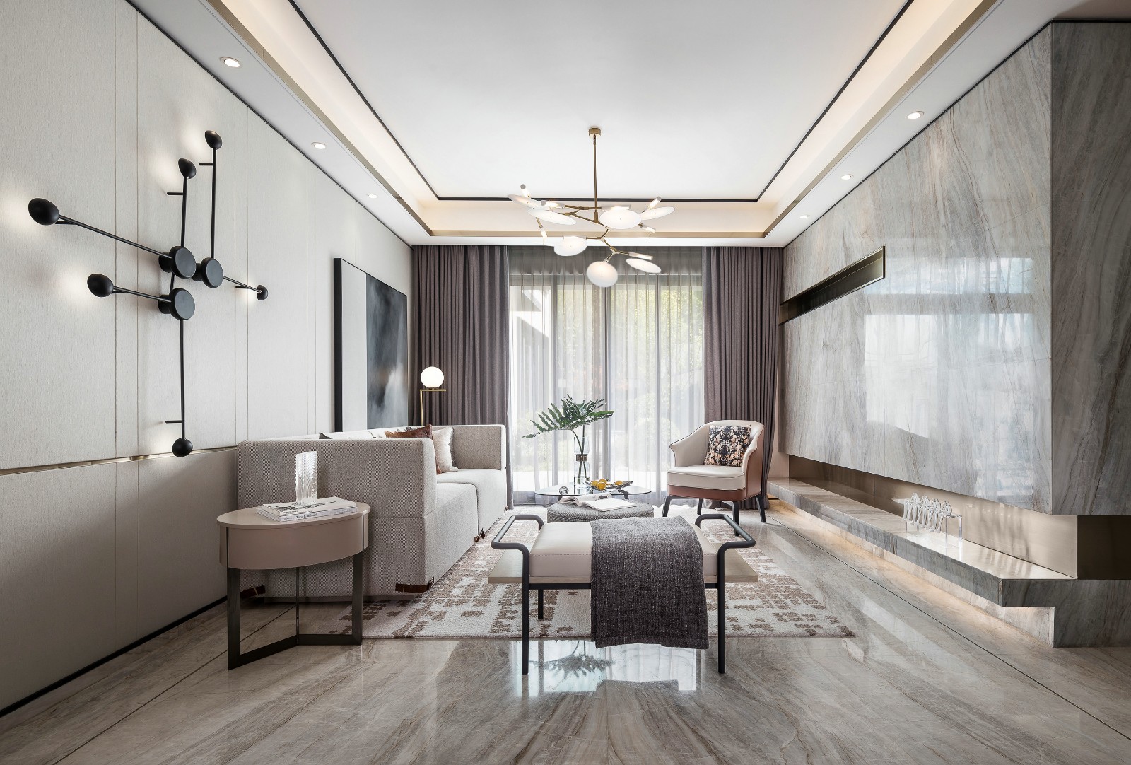 地面通铺大理石砖,空间显得更加明亮通透。电视墙舍弃了常规设计,用跟地面一样的大理石砖整面铺贴形成呼应,从视觉上放大了空间。