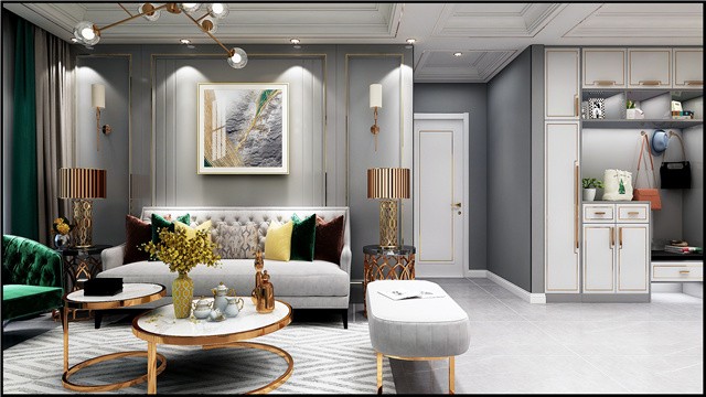 平顶嵌黑色不锈钢简约大气,瓷砖上墙的白色电视墙呼应灰色调的沙发背景
