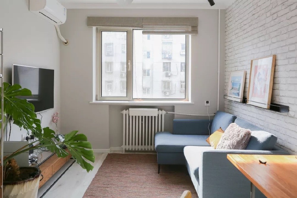 客厅的设计,王女士本来想走工业风,家具选好后有点走偏,索性不管什么固定的风格了,直接混搭,为弥补王女士的工业风梦,设计还是选择一面墙贴上砖墙样式的壁纸,相对于砖来说,更方便清洁。