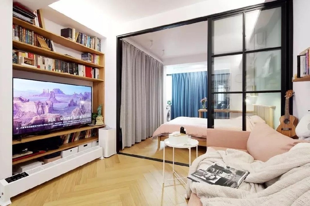 客厅与手握式中间隔着一扇黑色框的推拉门,打通后的卧室,整体视觉通透,空间感令人轻松惬意。