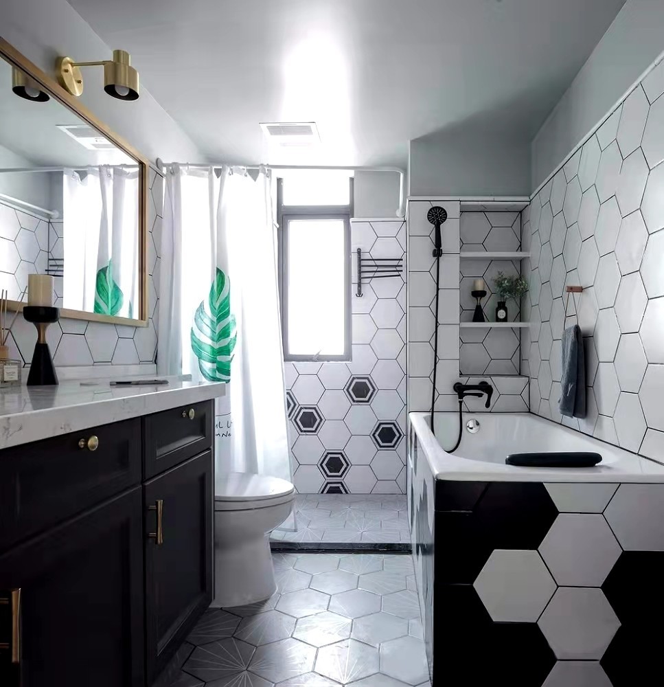 黑白颜色强烈对比,搭配6角砖增加设计感和空间感