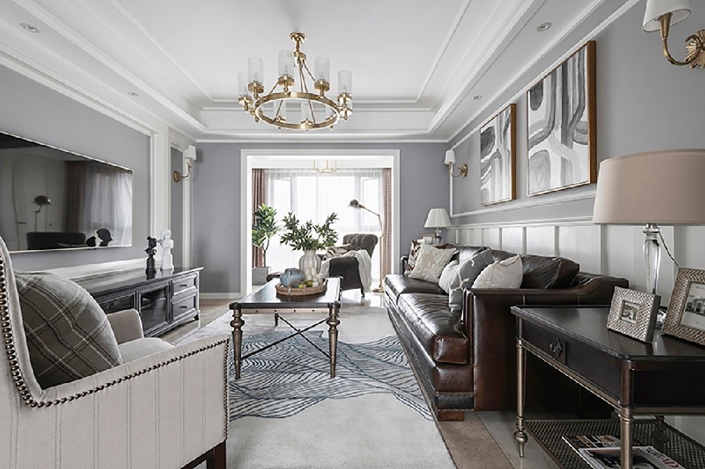 客厅是极简的现代美式设计,墙面上白与灰交叉分割,将整个空间轻轻托出。