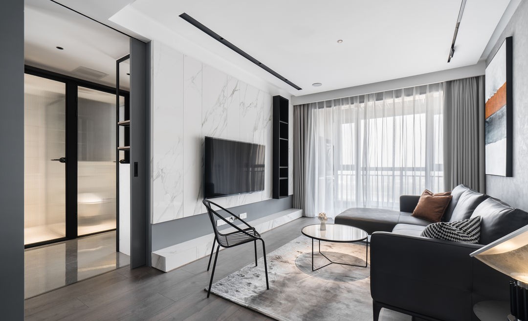 背景墙我们选用了水泥元素的意大利艺术漆,来制造出原始的水泥质感,电视背景用大理石纹理的岩板,与之对立为空间修饰,来营造硬装上的自然气息,搭配黑色皮质沙发,线条化的座椅及茶几,以黑白灰的主基调,细节化的处理,打造出会客休闲区的现代感。