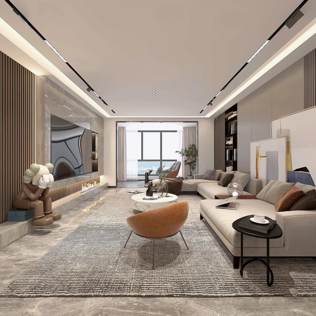 电视背景墙采用浅灰大理石岩板,内嵌金属展示架,展示架上可以摆放公仔、书籍、收藏品,效果不要太精致哦。