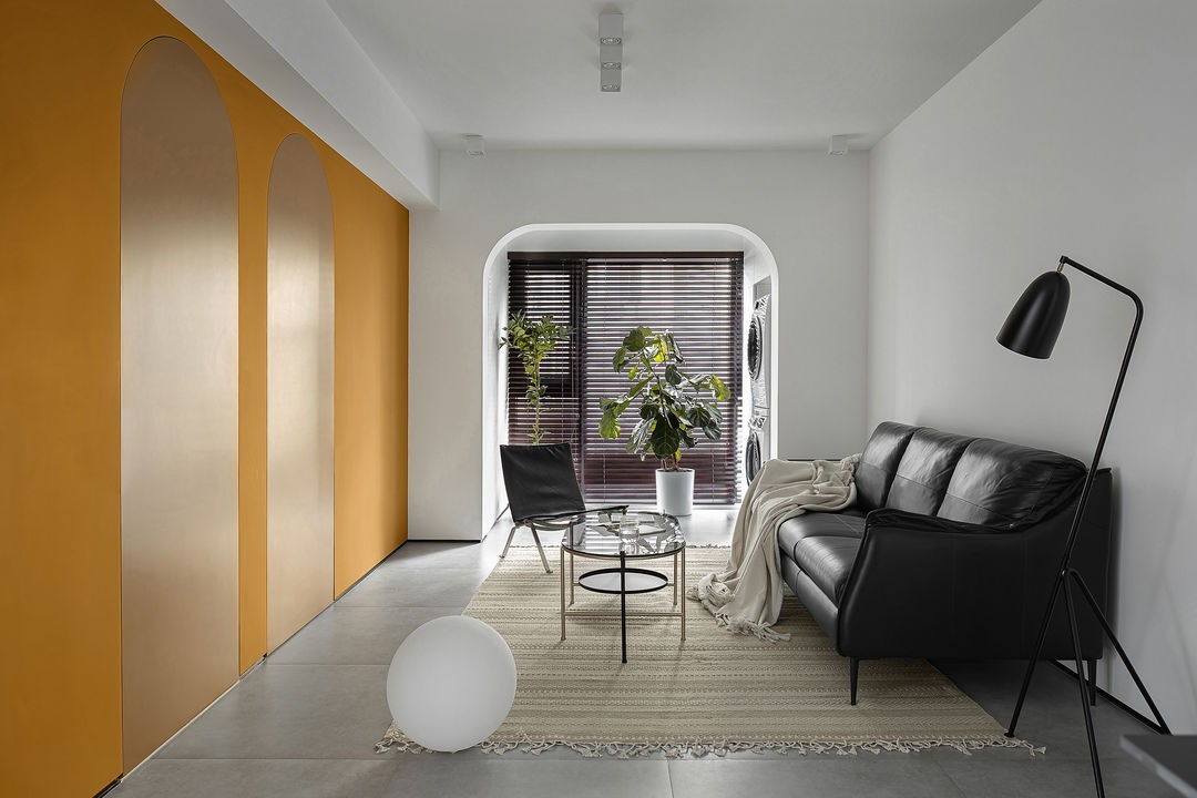 客厅白色调为主无须过度装饰,阳台自然光线的加持,姜黄色的点缀便是最干净的状态