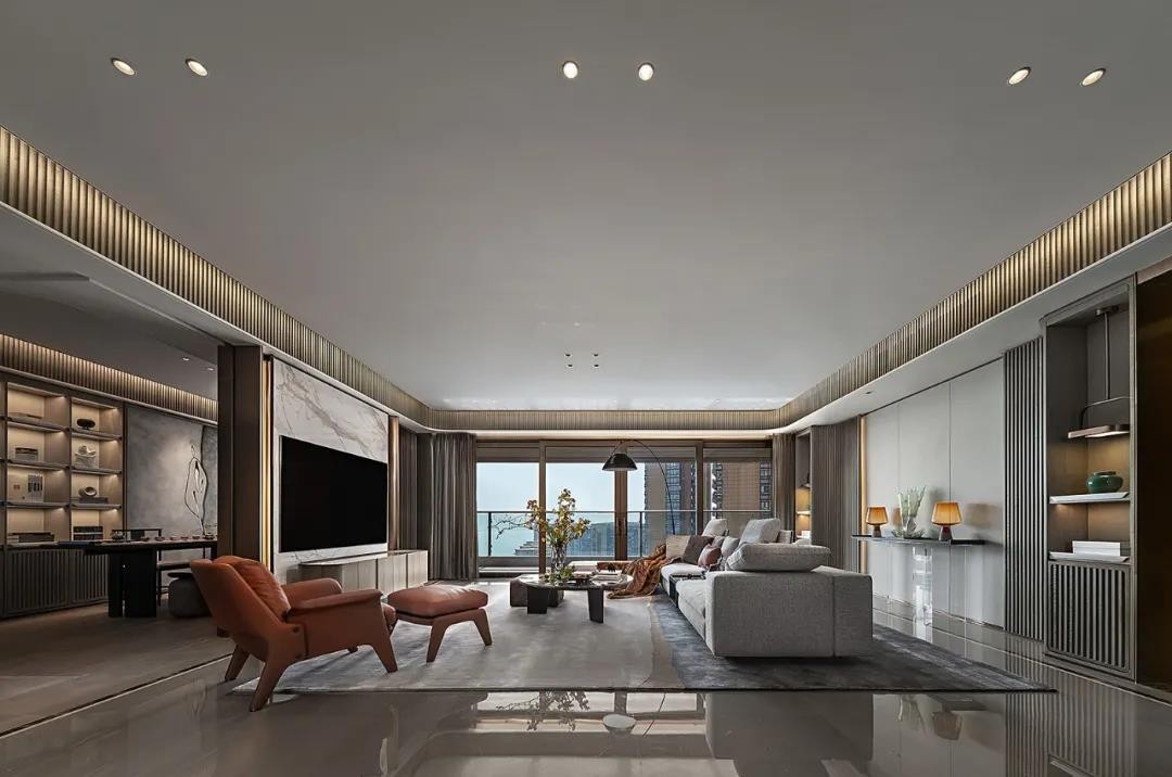 皮革、木饰、金属之间的材质碰撞,暖棕、雅木、米白的无声交汇,设计如同一只无形的手,平衡着空间艺术与生活的尺度。
