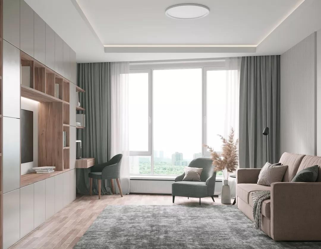 加上格栅饰面板和四周一层浅浅的吊顶,堆砌出空间线条***美感。
