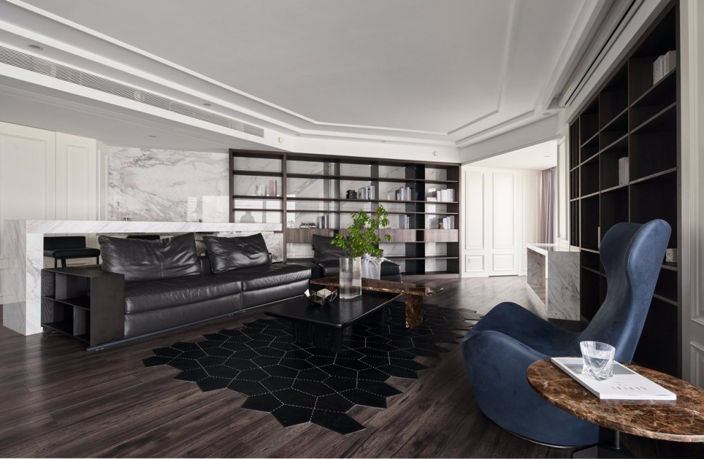 使用者是幸福的一家四口,两个小孩子都在上学的年龄,家庭的氛围和父母的陪伴尤其显得重要,男主更希望平面能有不一样的布法;设计师在深入了解客需后,首先空间采用动静分区,通过开放式的布局,营造了一个充分互动交流的公共空间,墙面大面积展架的设置,满足后期为孩子提供充足的书籍等精神食粮。