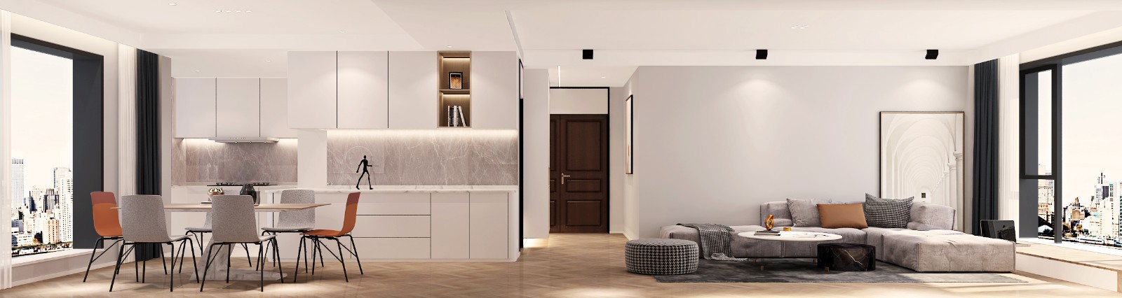 装修风格为现代简约,主题色调为白色,浅色,局部用深色作为点缀,用无主灯的设计手法作为整个屋子的光源设计。