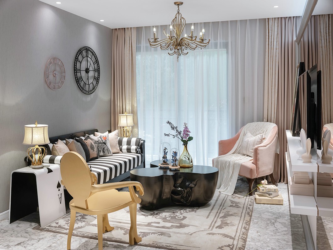 钟表形状的墙面装置、扑克梅花形茶几、粉色沙发、黑白条纹沙发、明黄色休闲椅、英式烛台形吊灯。
