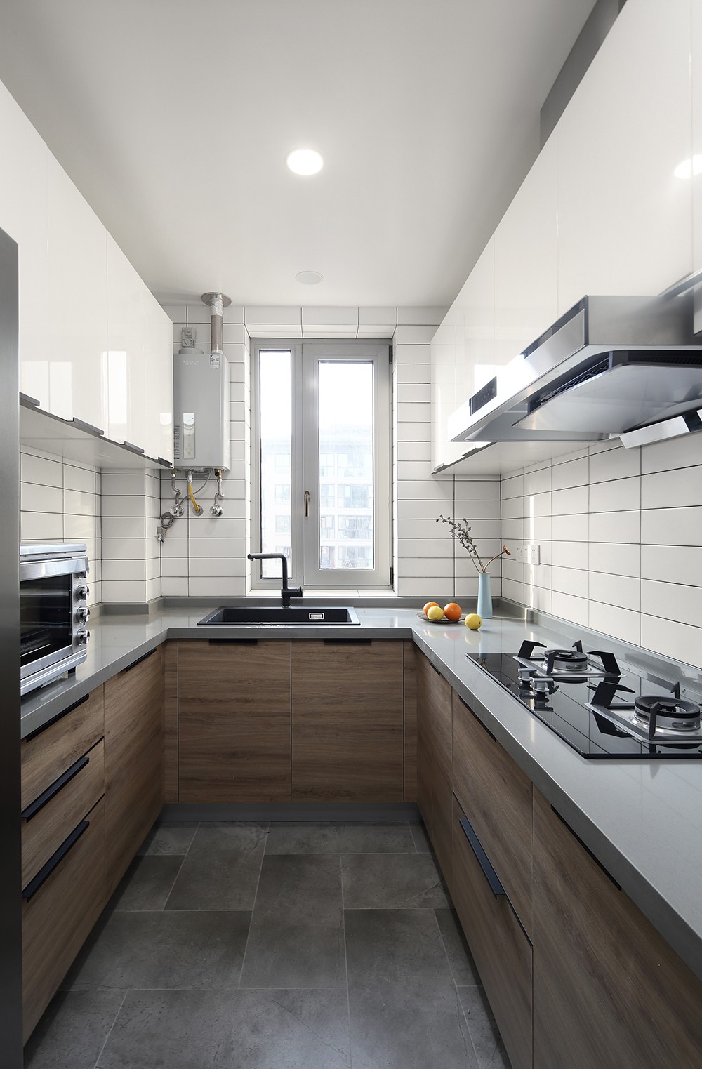 吊柜门是亮光烤漆密度板,地柜门是双饰面颗粒板,色彩上轻下重,搭配起来很稳妥;台面是石英石,选了个性少见的灰色,比白色的耐脏一些。