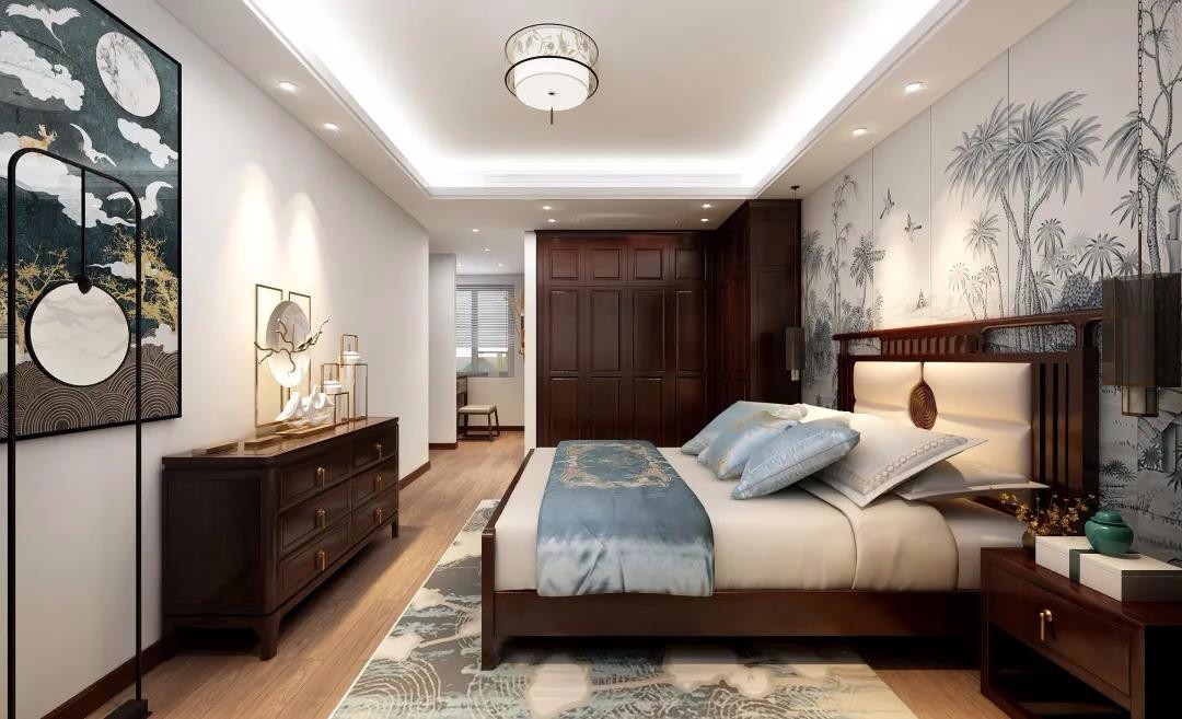 主卧灵动的背景墙设计,加上中式家具,古香古色的中式风格又不显厚重