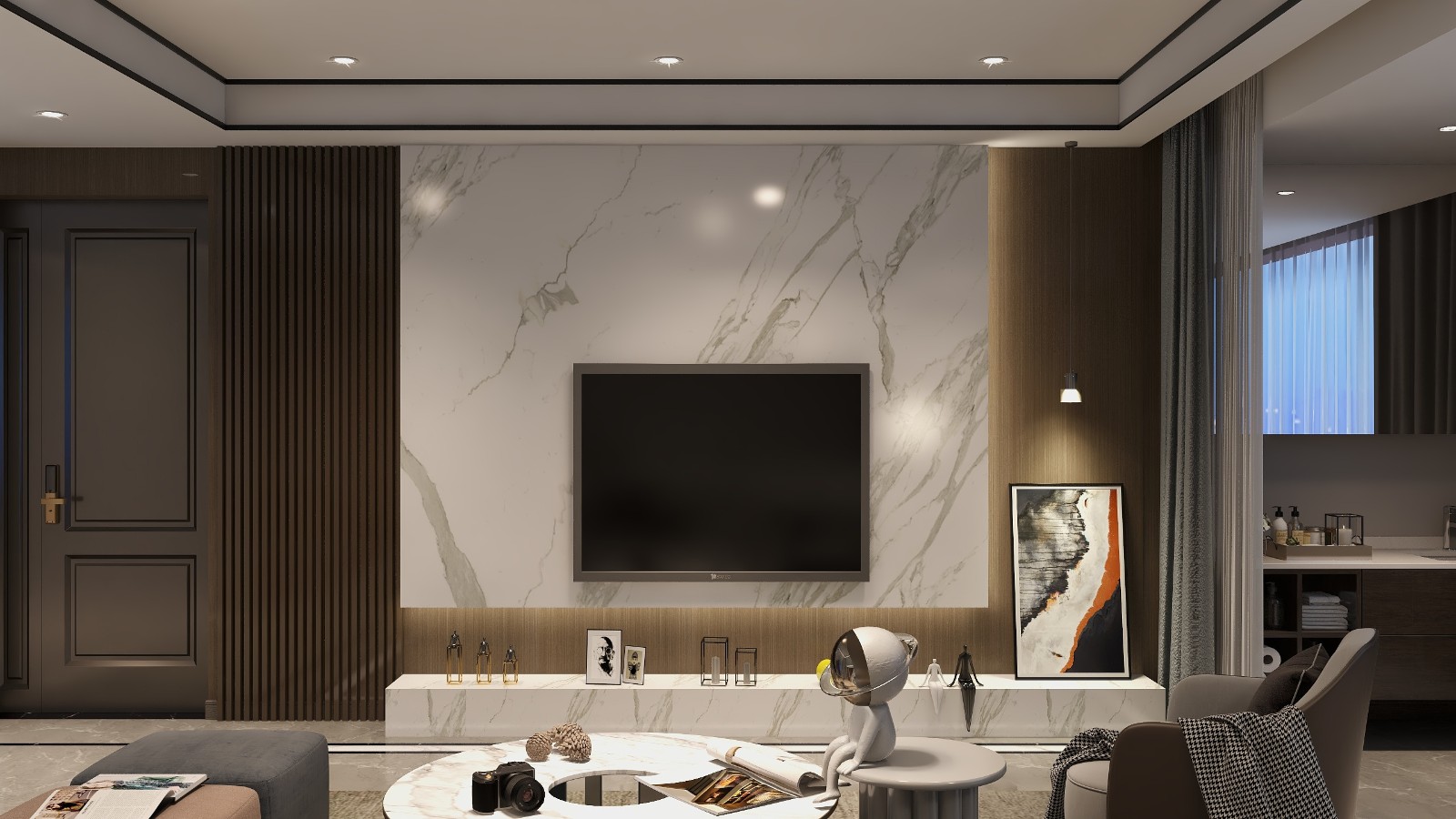空间上大气,简约不简单的现代风格,氛围上要求柔和、素雅一点,要求做出当下比较流行的无主灯设计,空间上要有比较舒适的健身区域和