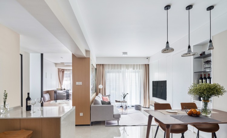 不局限空间布局,视觉上整体归一,创造简而不减的居住场所。同一个空间中材质的碰撞、照明的氛围、肌理的触感让赋予生活不一样的情调。