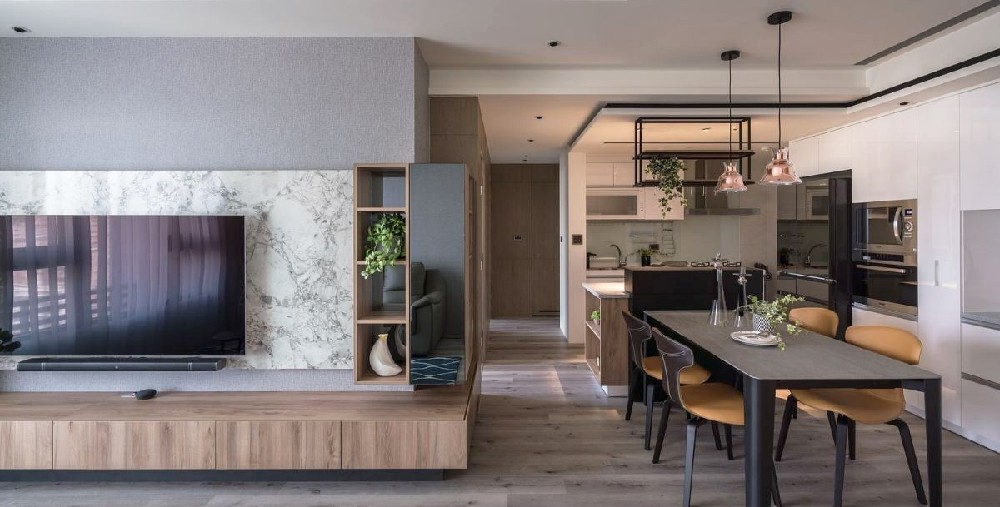 客厅电视墙整併石纹、镜面及木质,带出完整的展示区块,并且延伸至餐厨空间,串联起不同的生活场域,创造量体的轻盈质感。
