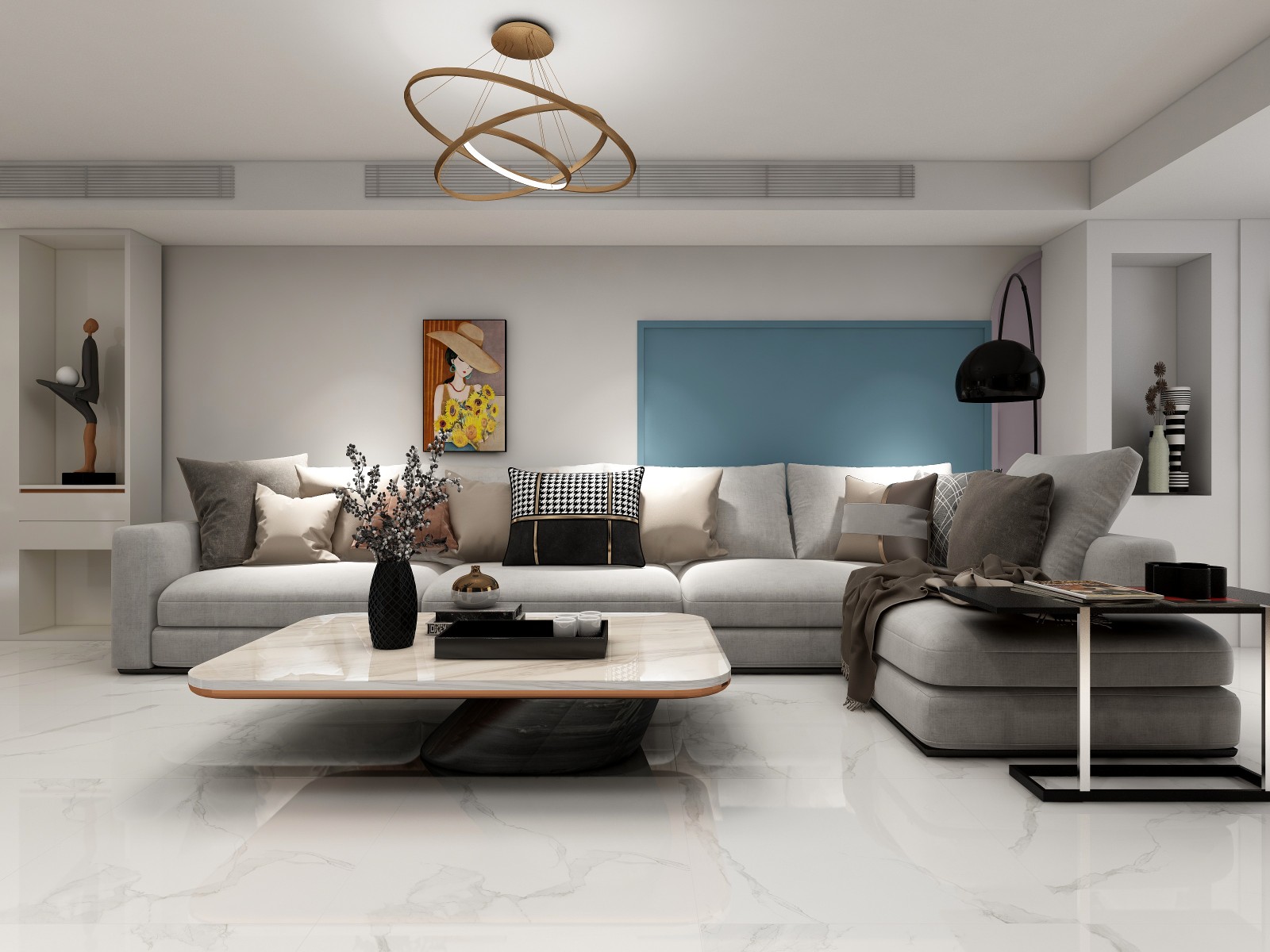 简约的空间,融入时尚的造型灯具,流线型强的茶几。