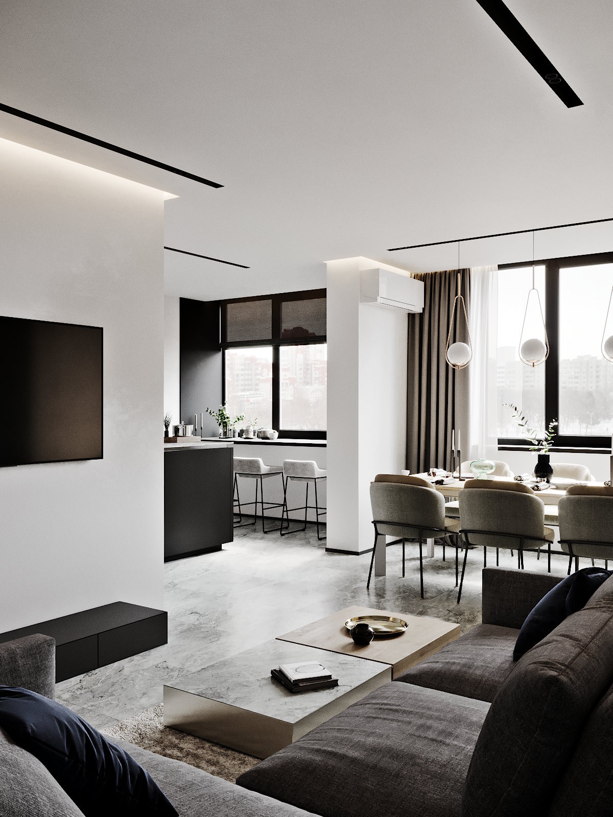 设计特色: 1.客厅和卧室的位置互换,将窗外苏州河的景观在家里公共区域呈现,同时进门的视角也会拉长; 2.吧台和餐厅联体,形成环形动线,客厅也在靠窗的位置,生活的动线比之前大为改善。 3.业主有在家办公的需求,希望有加宽的写字桌,可以办公,也可以很任性地在家拼模型、画画。
