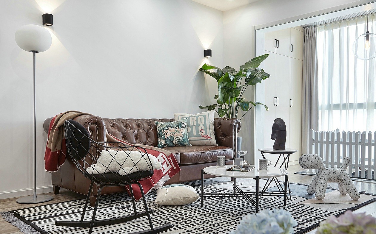 客厅电视背景墙是深色木饰面加上纹理清晰的鱼肚白岩板,为整个空间的沉稳大气注入轻快的气息,硬朗却又不失温润。