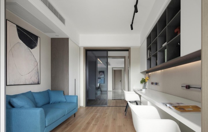 厅灰色为主基调的现代风格。简化的墙面处理,只在觉得有必要的区域使用了灰色木饰。放弃主灯,多种光源组合照明及装饰。