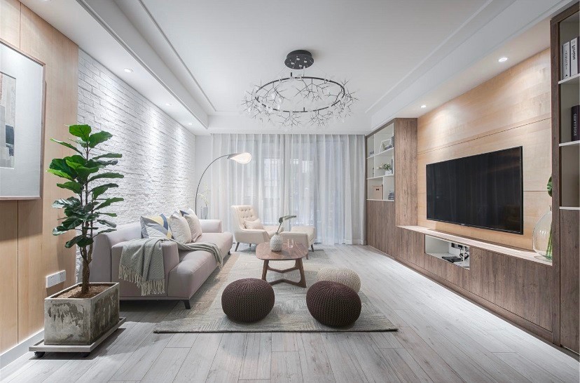 客厅基本色调 为白色、米色、浅木色 以白色为主调。北欧现代的完美搭配,给家一种温馨和舒适感