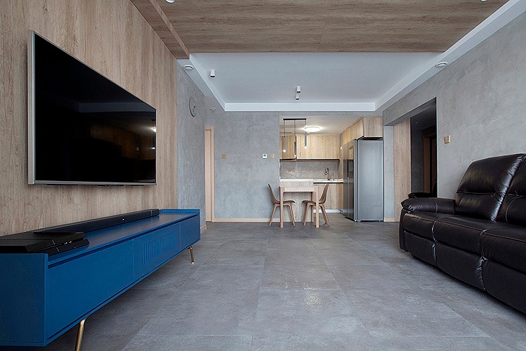 客厅是落地窗,光线自然没得说,所以家里的材质运用也不受颜色深浅的限制,屋里地面都是砂岩质感的水泥砖,电视背景的木饰面也延伸到顶面,坐到沙发的位置看过去,感觉非常好,像是身处大自然的环境里。