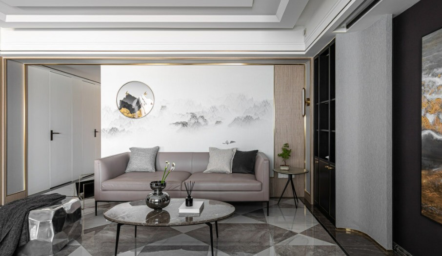 客厅背景淡淡的中式水墨壁画,让柔和的山水与棱角分明的地砖对比更加强烈.