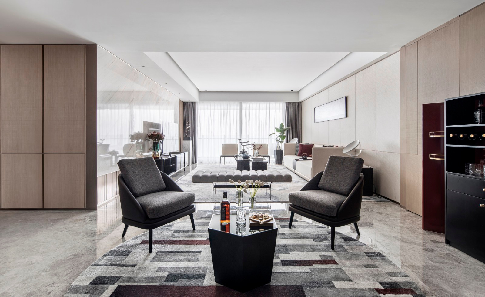 作为大横厅的中点,休闲区采用红色的落地小酒橱打破创造色彩节奏,乍眼一看有点像柴火正旺的壁炉。当浮一大白,这里也就顺理成章地成为全场视觉和社交的焦点。