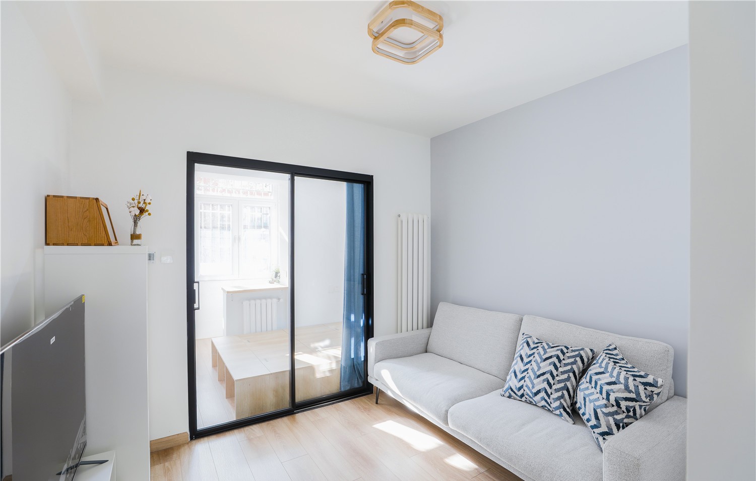 原本的客厅被设计师巧妙的分割出一个卧室来,中间是黑色边框的玻璃门,这样客厅的采光不受影响,太阳依然可以晒进来。