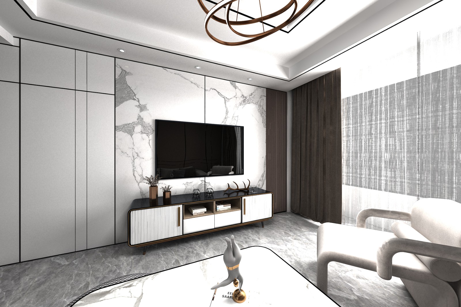 现代的石材纹理大板瓷砖作为背景墙的中心点,两边搭配长城板及硬包墙板,颜色和效果逐渐变化。
